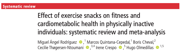 Rodríguez MÁ, Quintana-Cepedal M, Cheval B, et al Effect of exercise snacks on fitness and cardiometabolic health in physically inactive individuals: systematic review and meta-analysis, British Journal of Sports Medicine, Published Online First: 07 October 2025. doi: 10.1136/bjsports-2025-110027