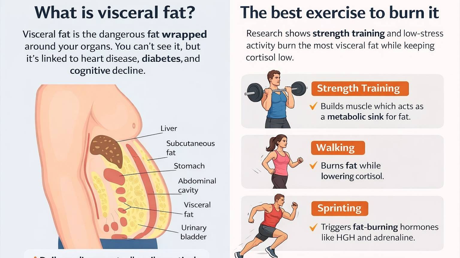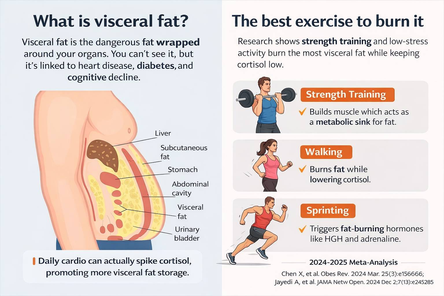 Visceral fat is the dangerous fat wrapped around your organs. You can't see it, but it's linked to heart disease, diabetes, and cognitive decline. And daily cardio can actually make it worse by spiking cortisol.