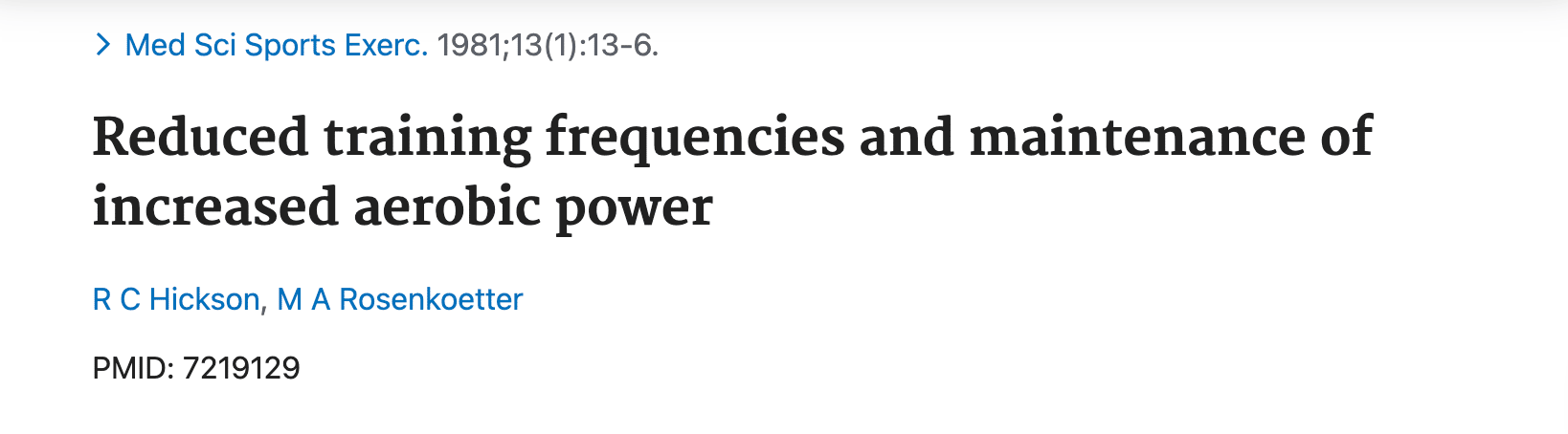 Hickson, R.C., Rosenkoetter, M.A. (1981). Reduced training frequencies and maintenance of increased aerobic power. Med Sci Sports Exerc. 1981;13(1):13-6. PMID: 7219129.