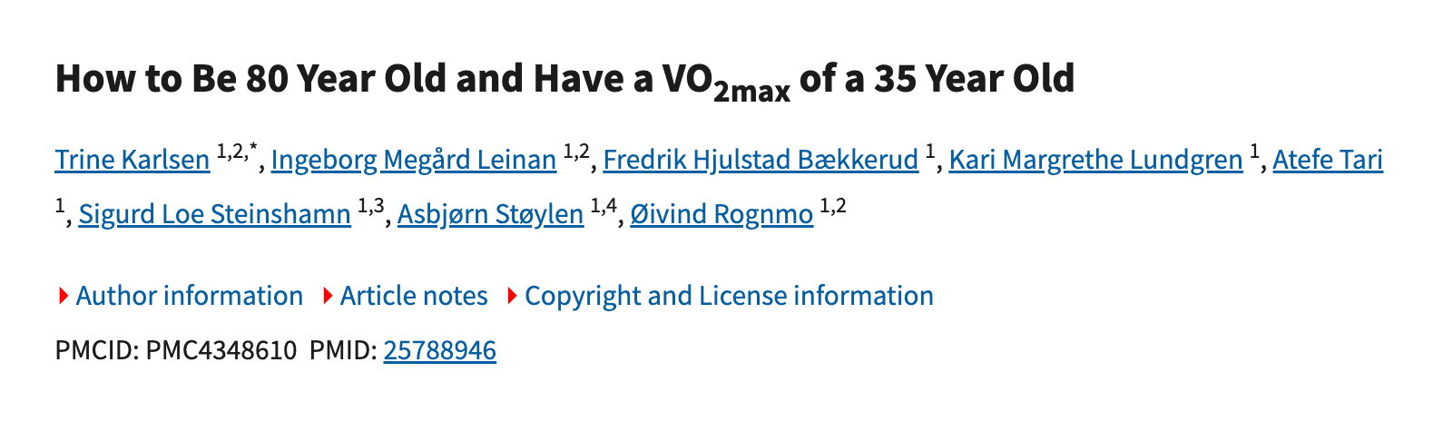 Karlsen T, Leinan IM, Bækkerud FH, Lundgren KM, Tari A, Steinshamn SL, Støylen A, Rognmo Ø. How to Be 80-Year-Old and Have a VO2max of a 35-Year-Old. Case Rep Med. 2015;2015:909561. doi: 10.1155/2015/909561. Epub 2015 Feb 18. PMID: 25788946; PMCID: PMC4348610.
