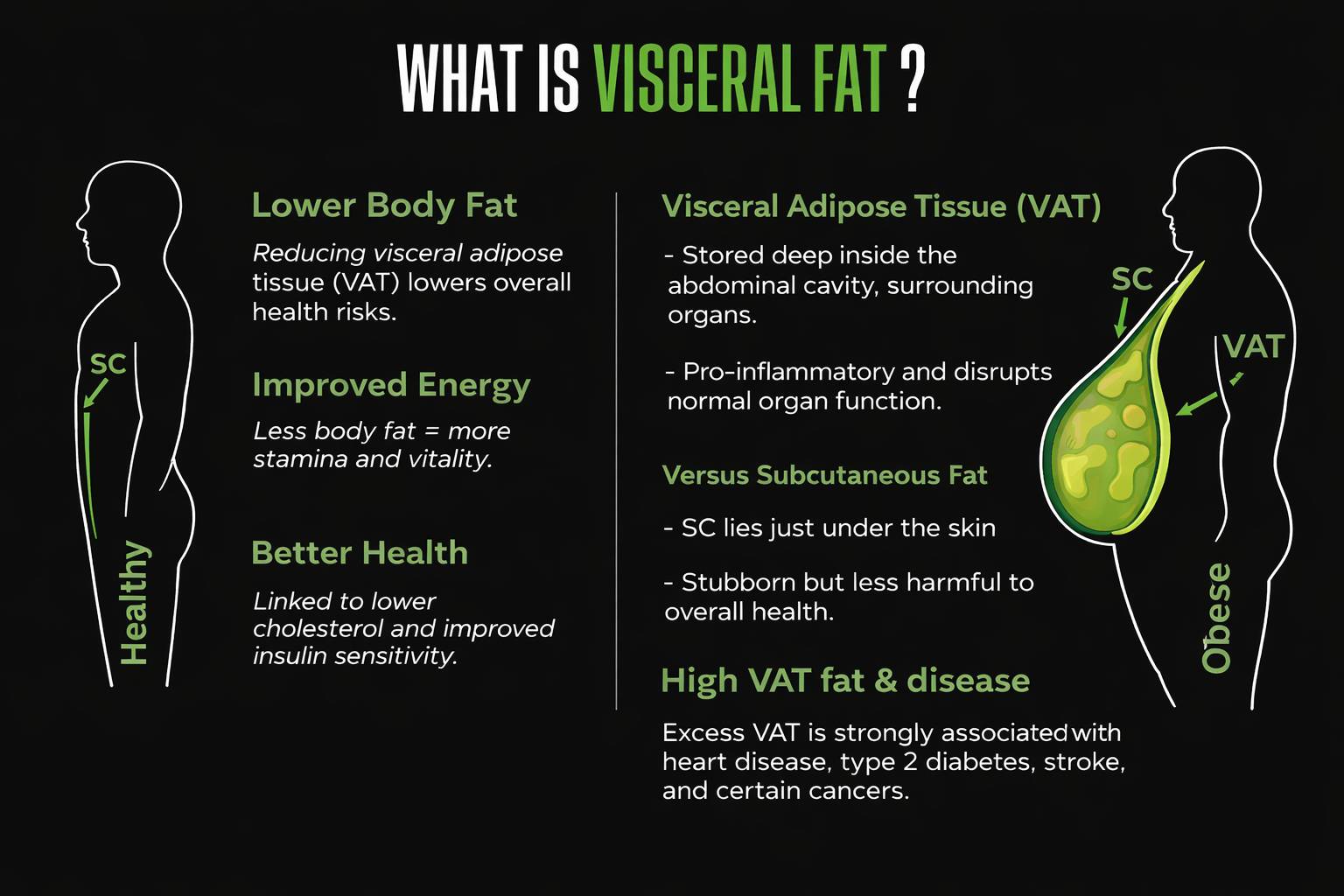 Visceral Fat (VAT) wraps around your organs. Unlike the fat you can pinch, it's metabolically active. It releases inflammatory compounds directly into your bloodstream.