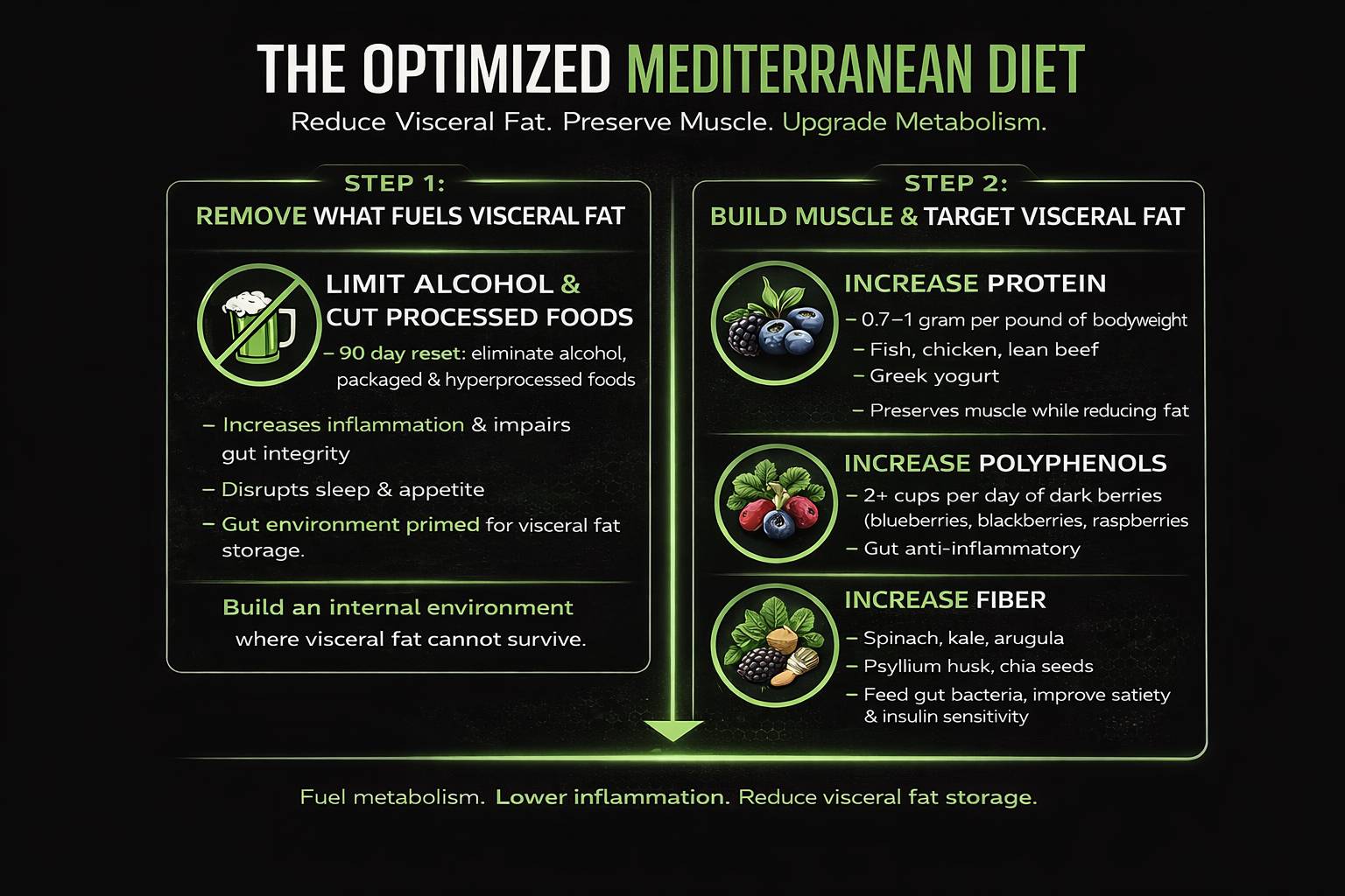 Added Dark Berries: Two cups a day of blueberries, blackberries, or raspberries. These are loaded with polyphenols that research shows help target visceral fat specifically by reducing inflammation in the gut.